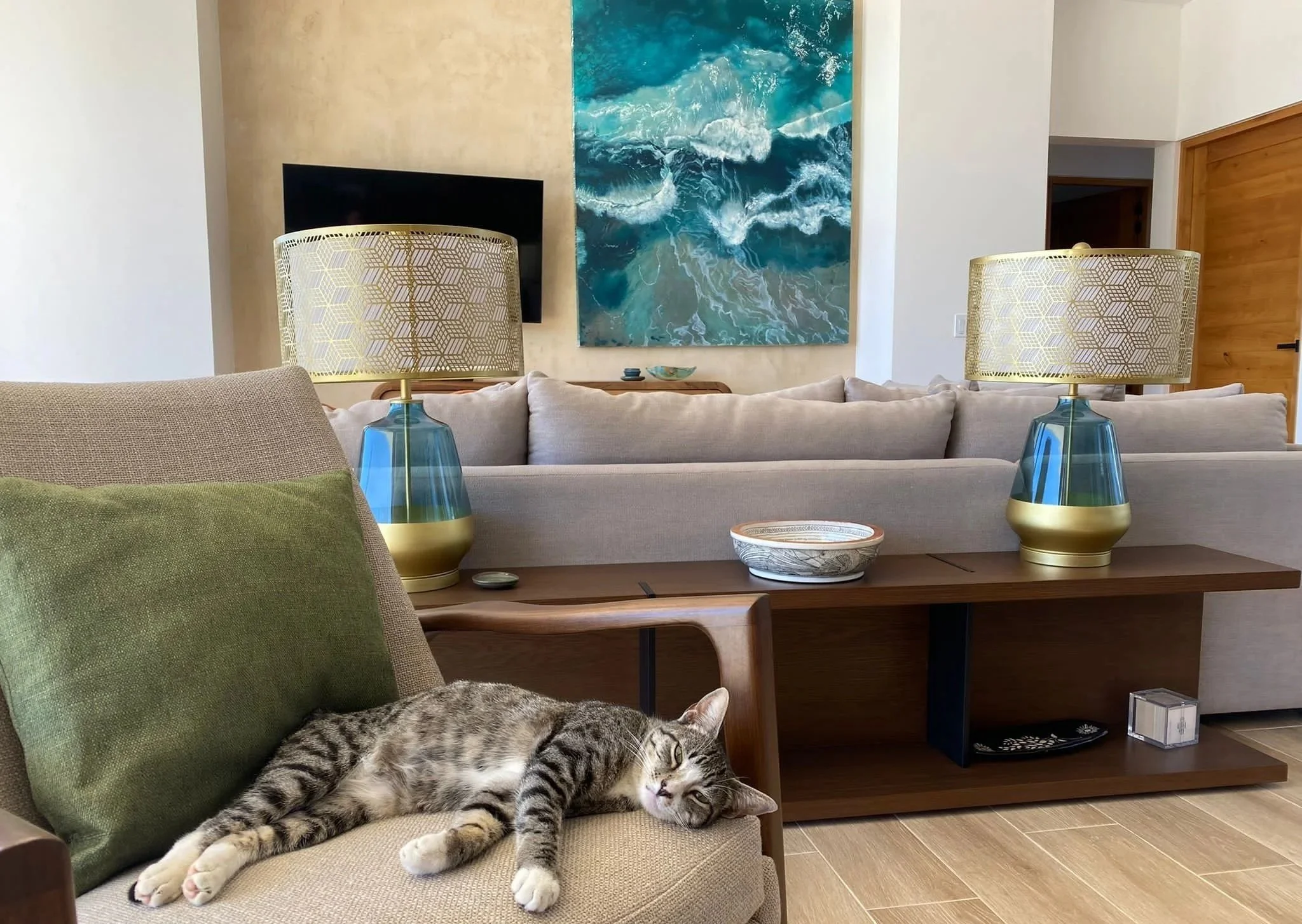 As an interior designer, I knew our Baja home was going to need a large impactful art piece as the main focal point in our spacious great room. Crazy luck brought us to Amanda’s studio and from the very first moment I laid eyes on her work I was certain I would have her art on our walls.